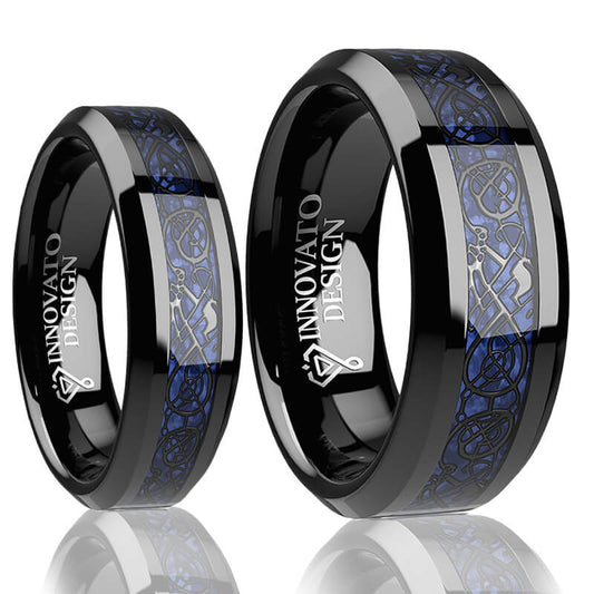 His & Her 6mm/8mm Celtic Dragon Blue Carbon Tungsten Carbide Wedding Bands