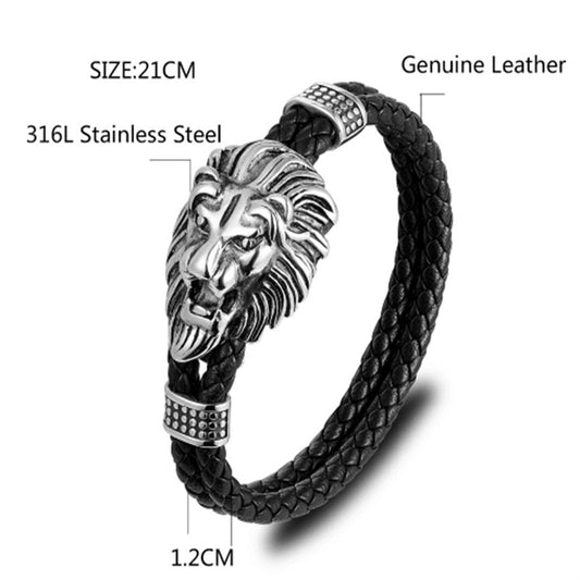 Lion Head Stainless Steel on Leather Wristband Bracelet