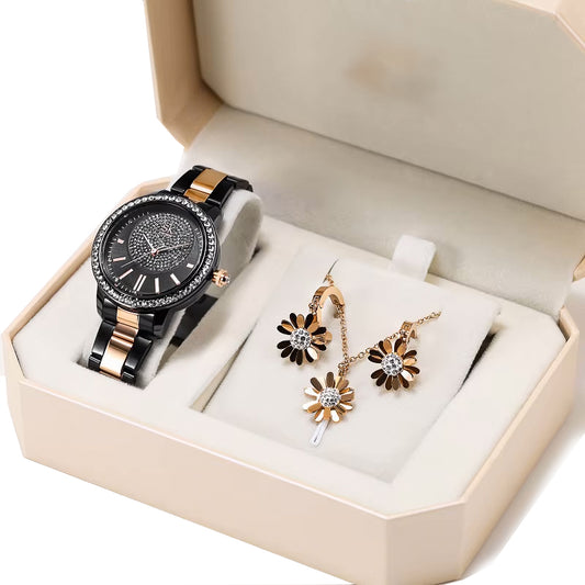 Luxury Quartz Watch, Crystal Necklace & Earrings Jewelry Set
