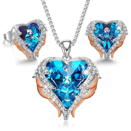 Luxury Crystal Heart and Angel Wings Necklace & Stud Earrings Jewelry Set