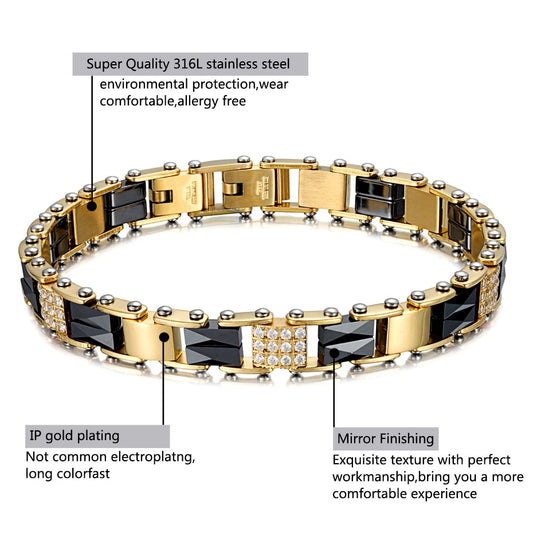 Luxury Gold Plated Magnetic Bracelet with Black Ceramics and Clear Zirconia