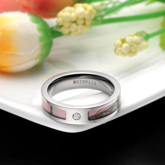 Pink Tree Camo Inlay & Cubic Zirconia Titanium Wedding Rings Set