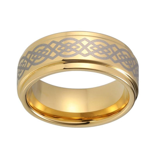 Polished Gold Coated Tungsten Carbide with Laser Engraved Knot Pattern Wedding Ring