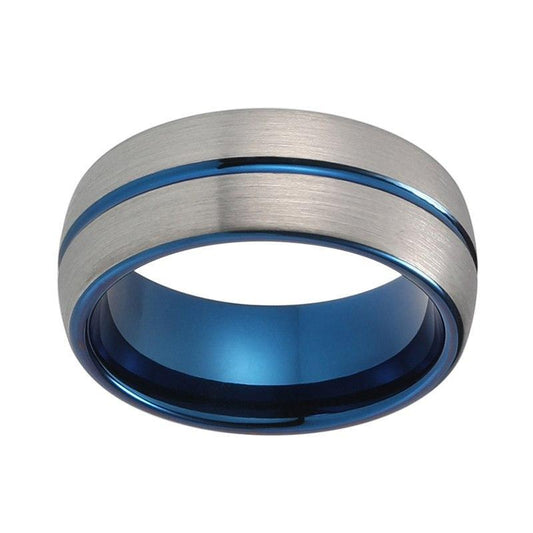 Royal Blue Silver Grey Coated Tungsten Carbide Brushed Matte Grooved stripped Center Wedding Band