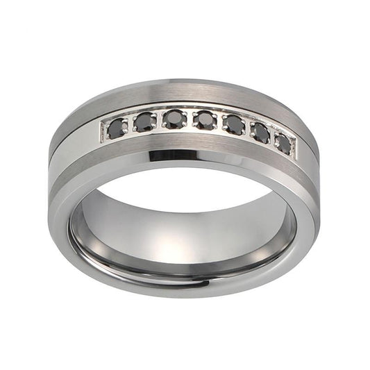 Silver Coated Tungsten Ring with Brushed Matte Surface and Gem Stone Center Insert