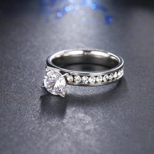 Silver Plated Fashionable Engagement Ring for Women with Circle Zircons and One Big Central Clear Zircon