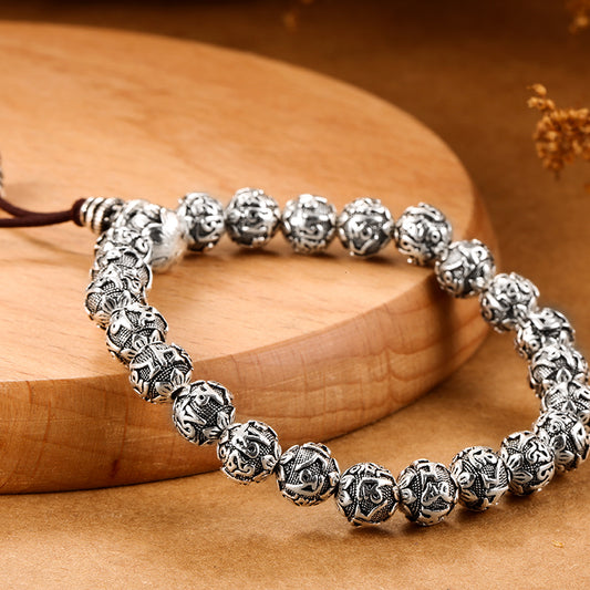 Six Words Mantra Tibetan Buddhism Rope Pure Silver Vintage Bead Bracelet