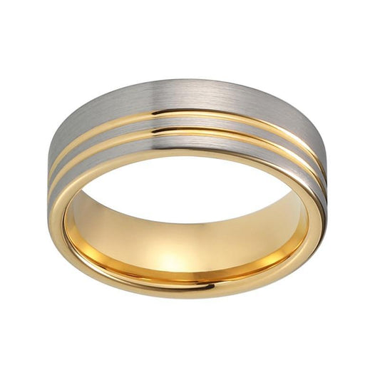 Unequaled Strip Brushed Matte Silver Coated Tungsten Gold Coated Grooved Pipe Cut Wedding Band