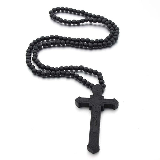 Wooden Cross Bead Rosary Necklace