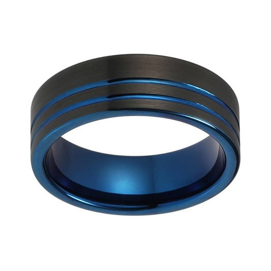 8mm Double Groove Blue Tungsten Carbide with Offset Black Brushed Tungsten Ring
