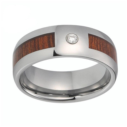 8mm Silver Polished Tungsten Carbide with Wood Inlay and White Crystal Gem Stone Ring