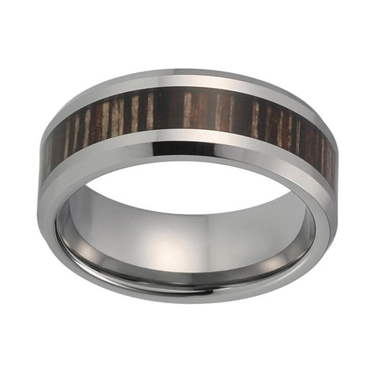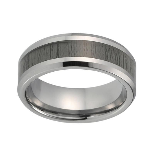 8mm Silver Polished Tungsten Carbide Ring with Grey Natural Wood Inlay