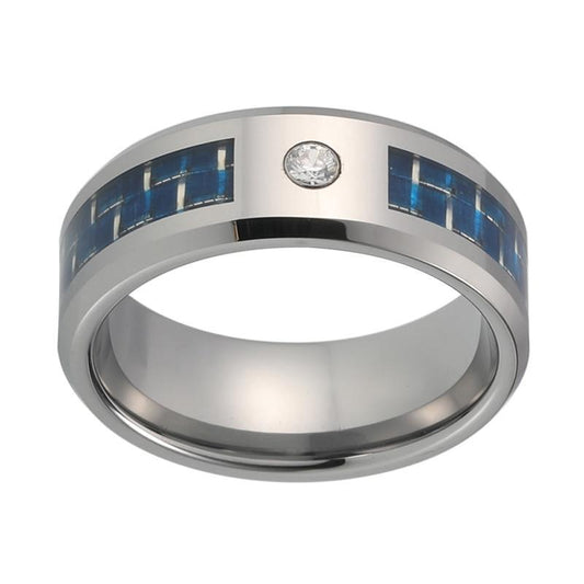 8mm Silver Coated Tungsten Carbide Ring with CZ Stone and Blue Block Pattern Inlay Wedding Band