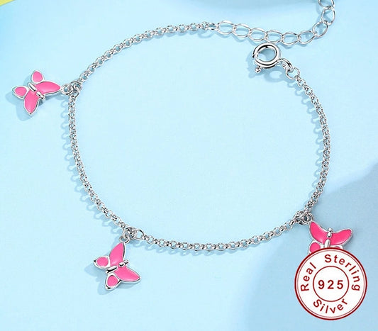 925 Sterling Silver Lovely Pink Butterfly Pendant Bracelet