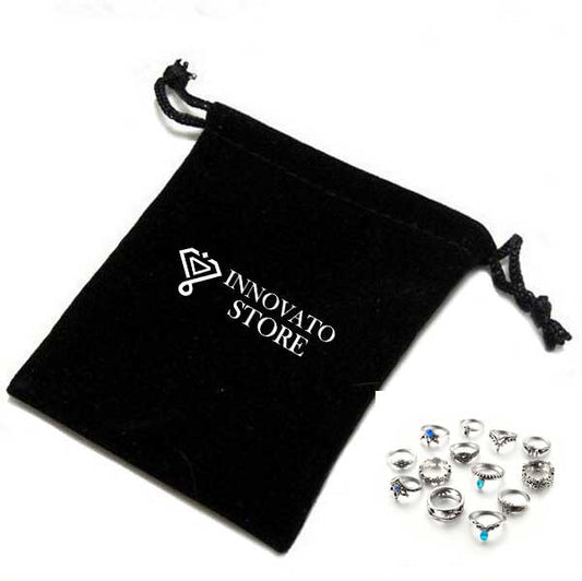 Antique Retro Bohemian Set of 13 Rings for Women with Flower and Geometric Design and Blue Tone Rhinestone
