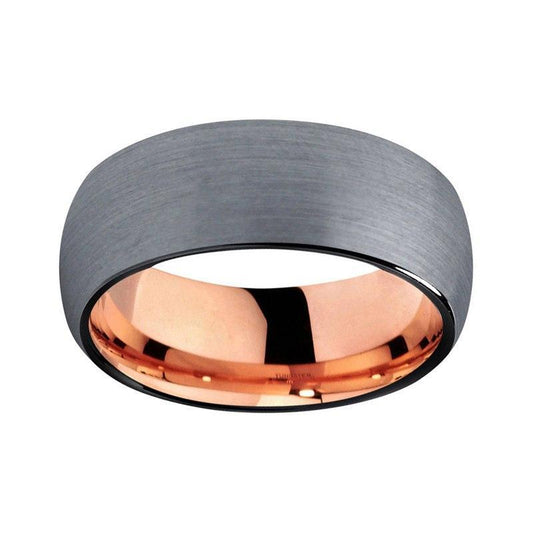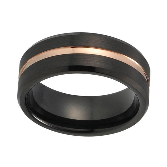 Black Brushed Tungsten Carbide with Shiny Edges and Rose Gold Plated Tungsten Interior Band