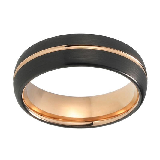 Black Brushed Tungsten Surface with and Rose Gold Plated Tungsten Grooved Wedding Band