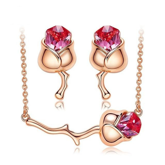 Black Crystal Rose Sideways Necklace & Earrings Jewelry Set