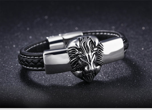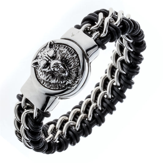 Black Genuine Leather with Gold and Silver Wolf Bracelet