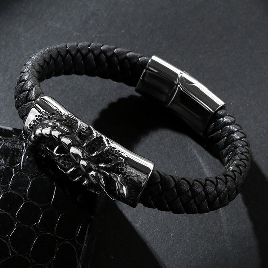 Black Leather and Stainless Steel Scorpion Bangle Bracelet for Men