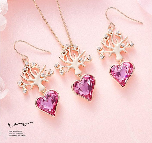 Crystal Heart & Fashion Tree Rose Gold Necklace & Earrings Jewelry Set