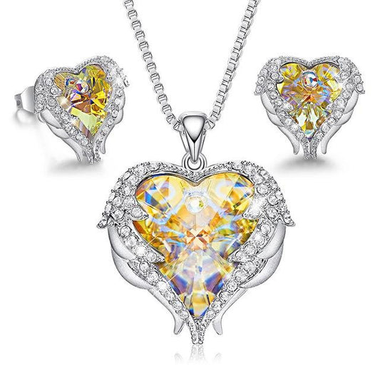 Crystal Heart and Angel Wings Necklace & Earrings Jewelry Set