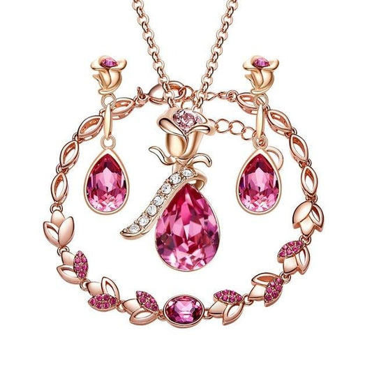 Crystal and Rose Necklace, Bracelet & Earrings Jewelry Set