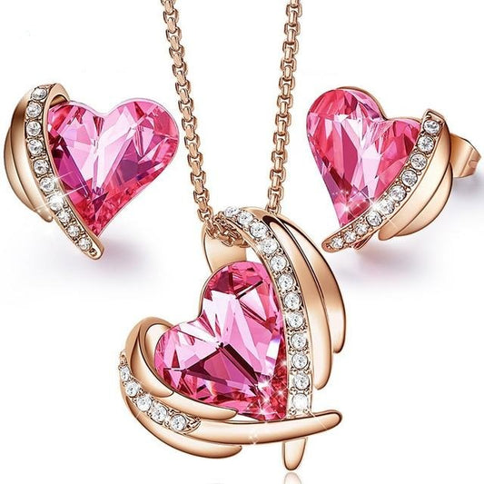 Crystal Pink Heart and Angel Wings Necklace & Earrings Jewelry Set