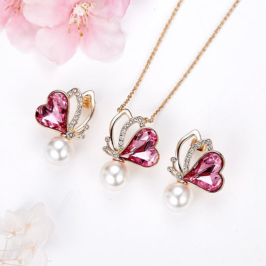 Crystal Heart Rose Gold Butterfly Necklace & Earrings Jewelry Set