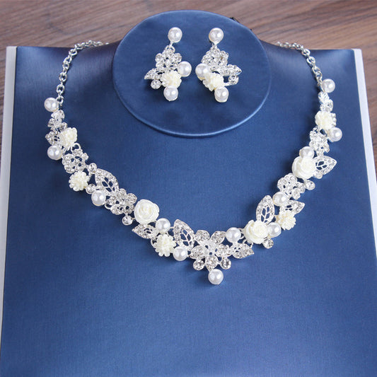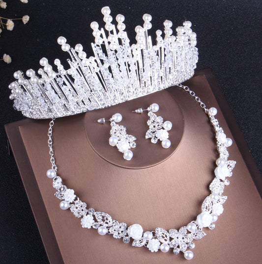 Crystal, Pearl, Flower and Rhinestone Tiara, Necklace & Earrings Jewelry Set