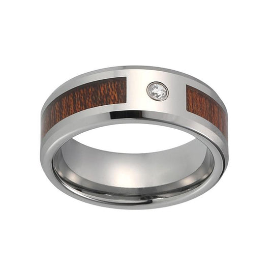 Dark Wood Inlay with Silver Coated Tungsten Carbide and CZ Stone Wedding Ring