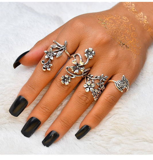 40mm Vintage Bohemian Antique Silver Toned Women’s Flower Ring Set