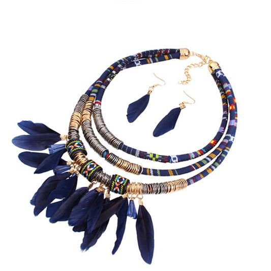 Ethnic Feather Tassel Multilayer Necklace & Earrings African Jewelry Set