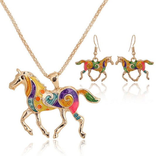 Enamel Horse Necklace & Earrings Gold Plated Jewelry Set