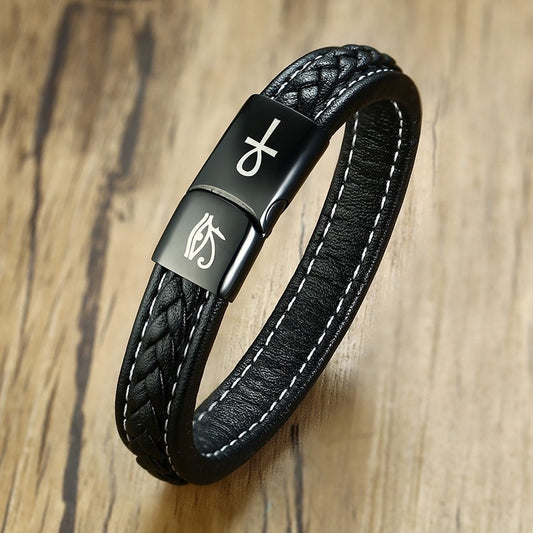 Engraved Ankh Cross and Eye of Horus Leather Bracelet