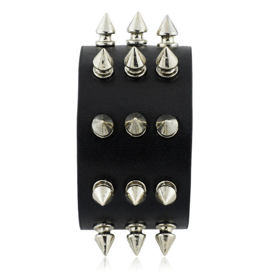 Gothic Three-Row Metal Cone Spikes Leather Bracelet