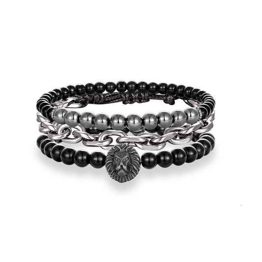 Set of 3 Multilayer Leather, Beaded & Stainless Steel Link Chain Charm Bracelet