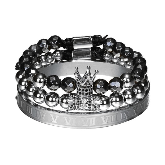 Set of 3 Crown, Roman Numerals & Hematite Beads Luxury Bracelet