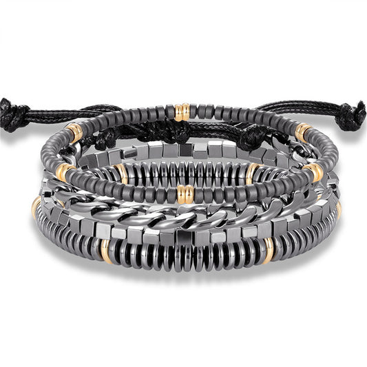 3 or 4-Set Natural Matte Hematite Beads, Metal Chain Strand, Cross & Dumbbell Bracelet
