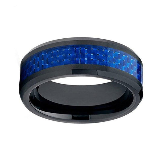8mm Black Ceramic Band with Beveled Edges and Blue Carbon Fiber Inlay