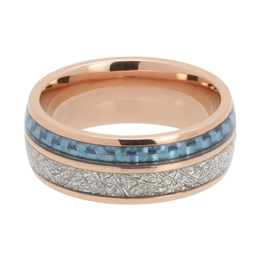 Unisex Rose Gold-Coated, Blue Carbon Fiber and Meteorite Inlay Wedding Band