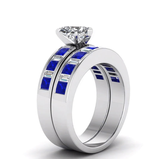 Silver Brushed Matte & Blue Inlay Band and White & Blue Zirconia Wedding Ring Set