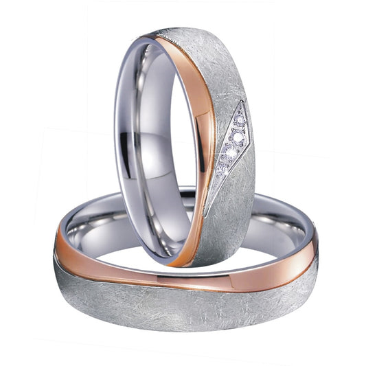 Matte Silver & Rose Gold Titanium Steel and Cubic Zirconia Wedding Bands Set