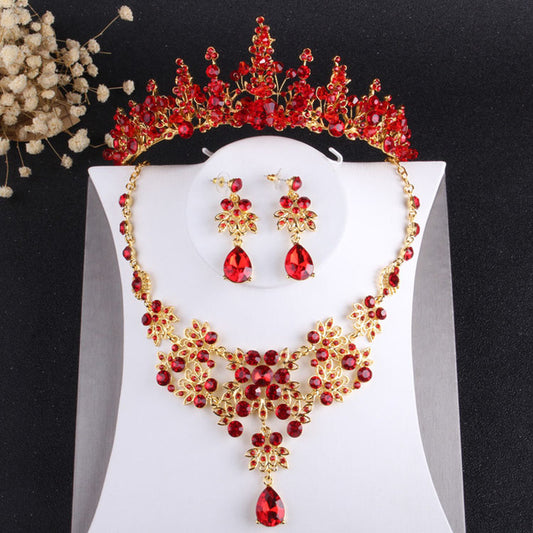 Gold Red Crystal and Rhinestone Tiara, Necklace & Earrings Baroque Vintage Jewelry Set