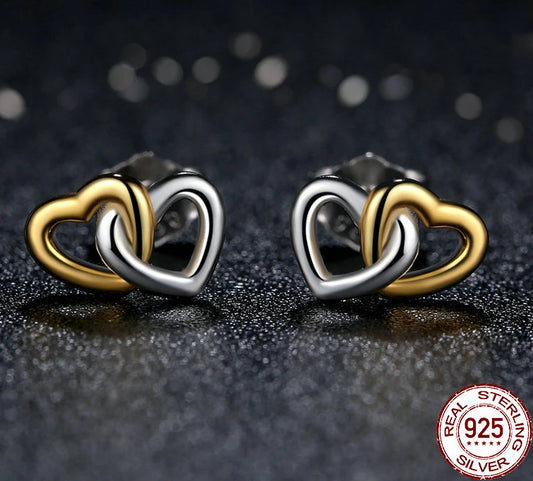 925 Sterling Silver Gold and Silver Connected Hearts Stud Earrings