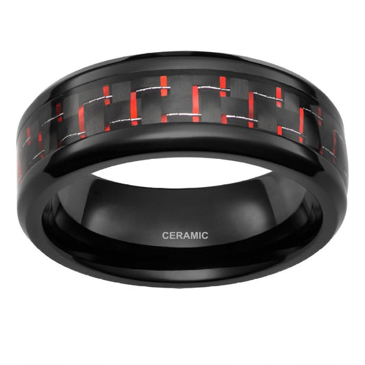 8mm Black Carbon Fiber Red Inlay Ceramic Wedding Band