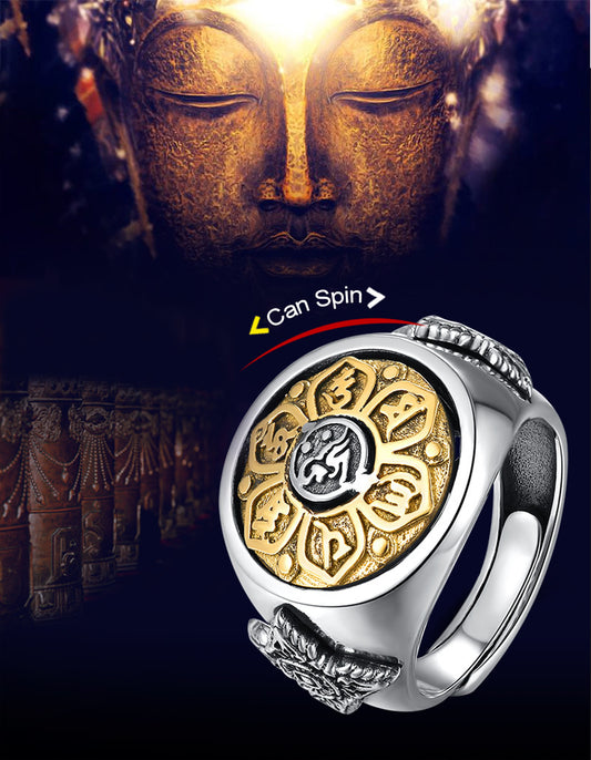 Buddhism Six Words Signed Spinner 925 Sterling Silver Vintage Ring