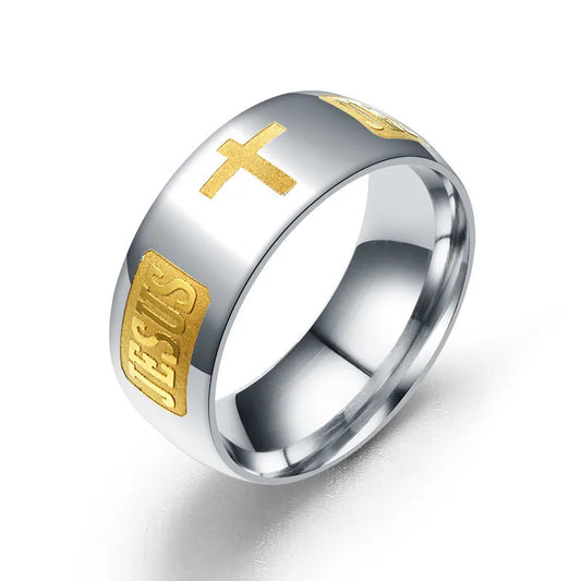 Pious Titanium 8mm Silver and Gold Toned Men’s Christian Jesus Cross Wedding Band
