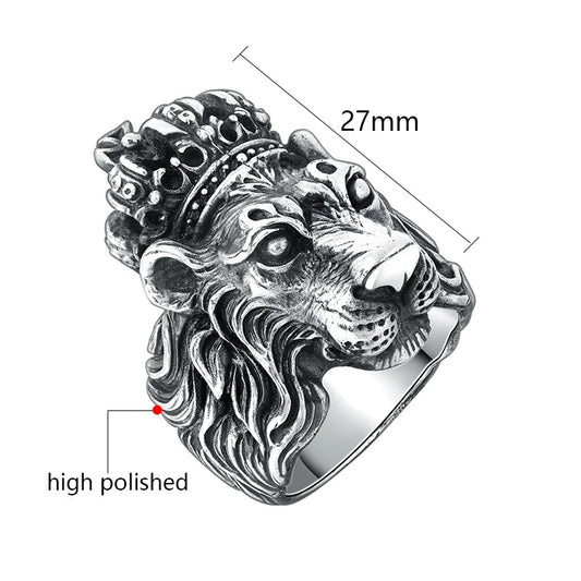 King Lion Silver Plated Ring with Crown for Men Vintage Biker Ring