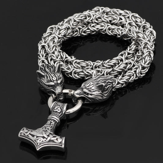 Stainless Steel Wolf Head and Thor's Hammer Pendant Necklace for Men